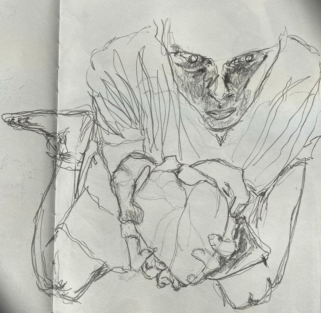 Coddled there with his body in his arms and all its bones